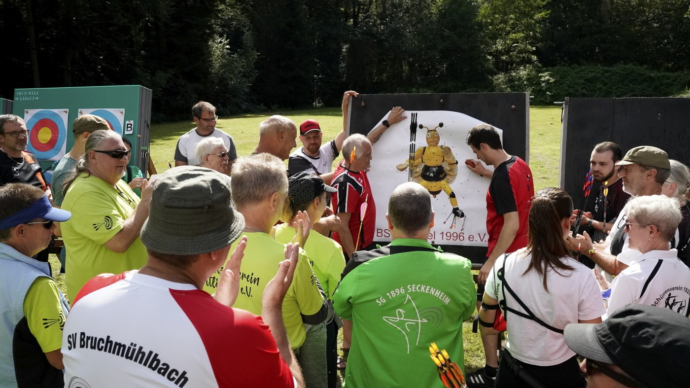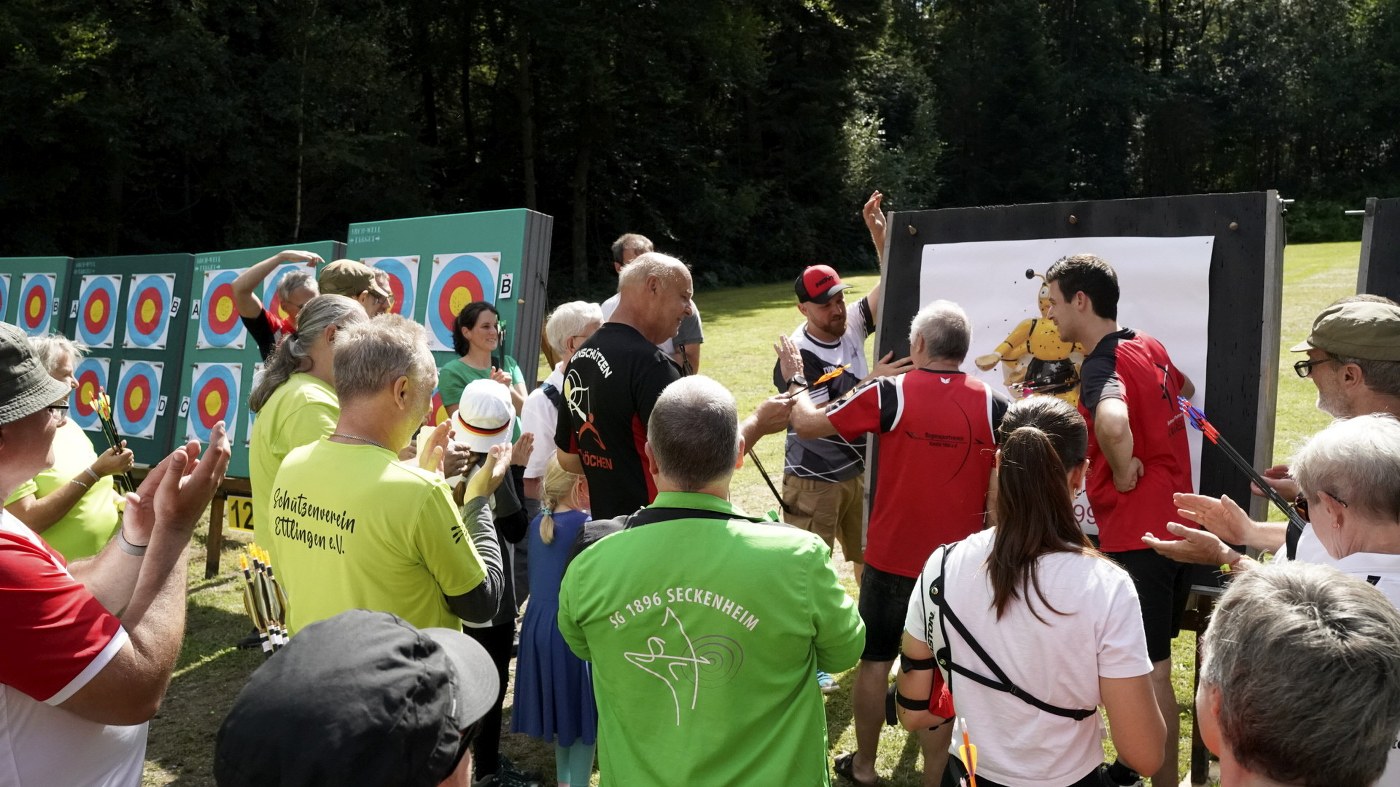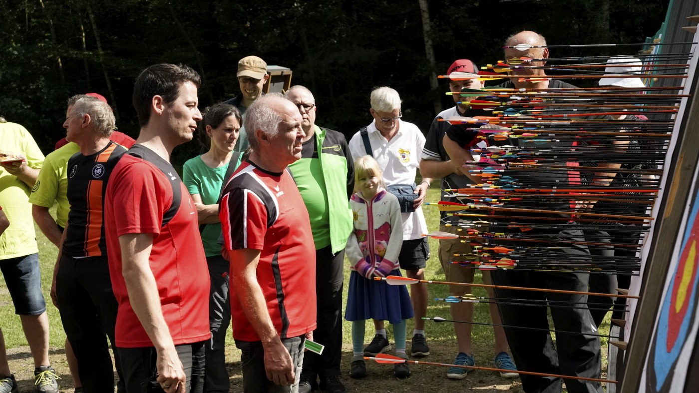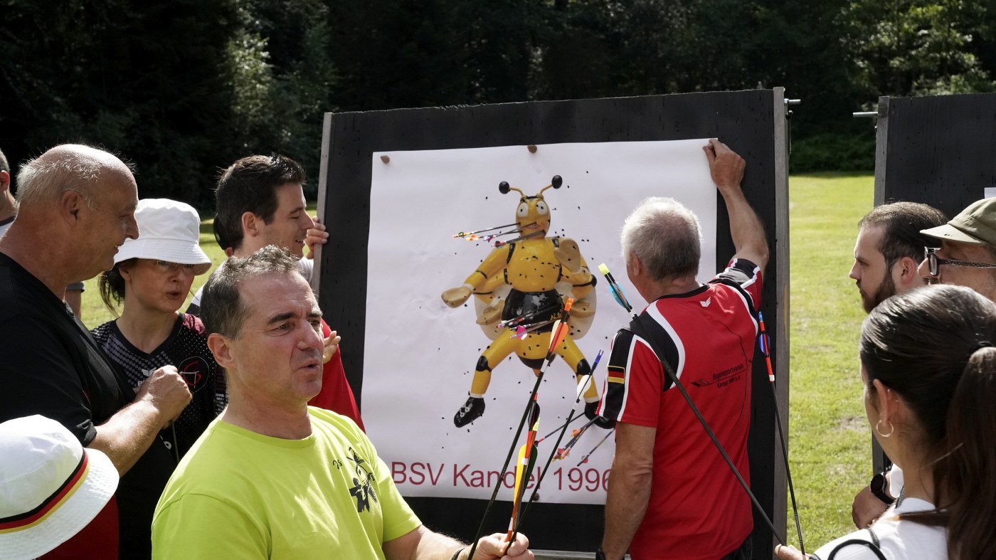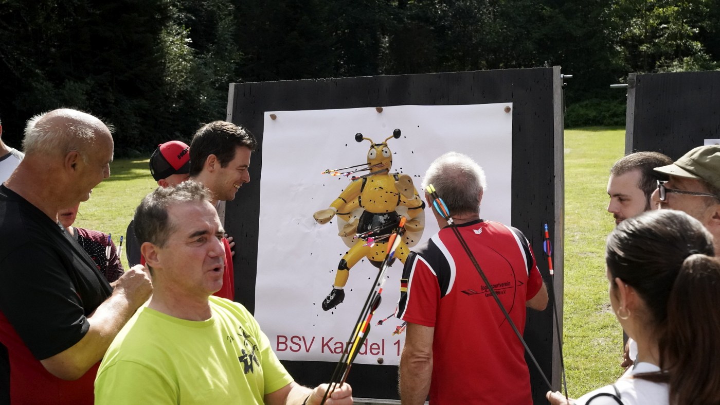 Besonders großer Beliebtheit erfreut sich unser Glücksschuss, der immer nach dem Wettkampf durchgeführt wird. Die Schützinnen und Schützen schießen hierzu Pfeile auf unsere Bienwald-Biene. Wer dabei am nächsten an eine geheim markierte Stelle trifft, gewinnt einen riesigen Präsentkorb. Die Spannung, wer am Ende das meiste Glück hat, war vorprogrammiert.