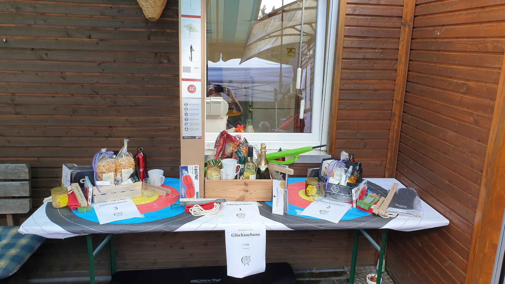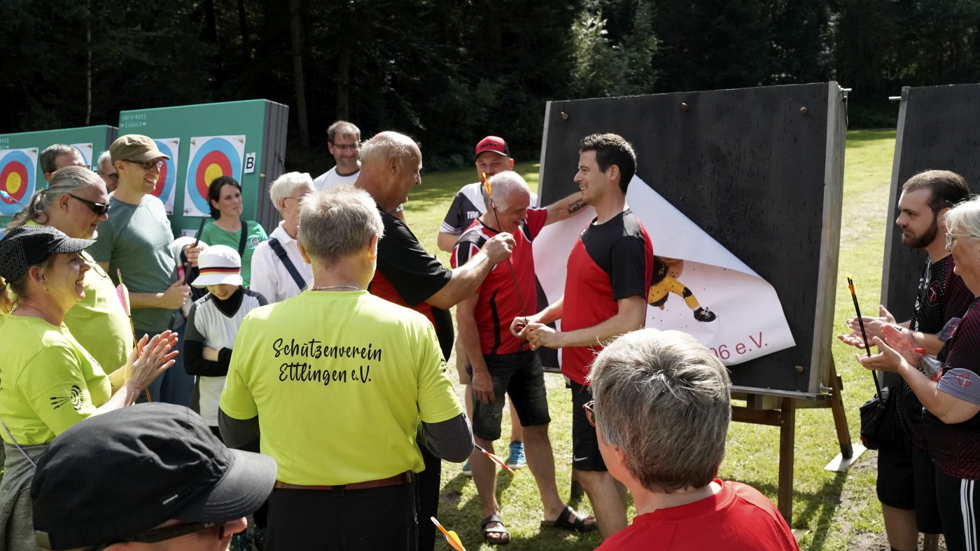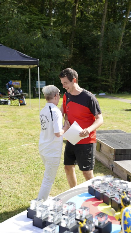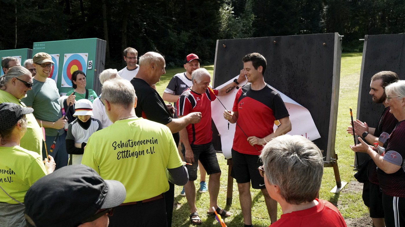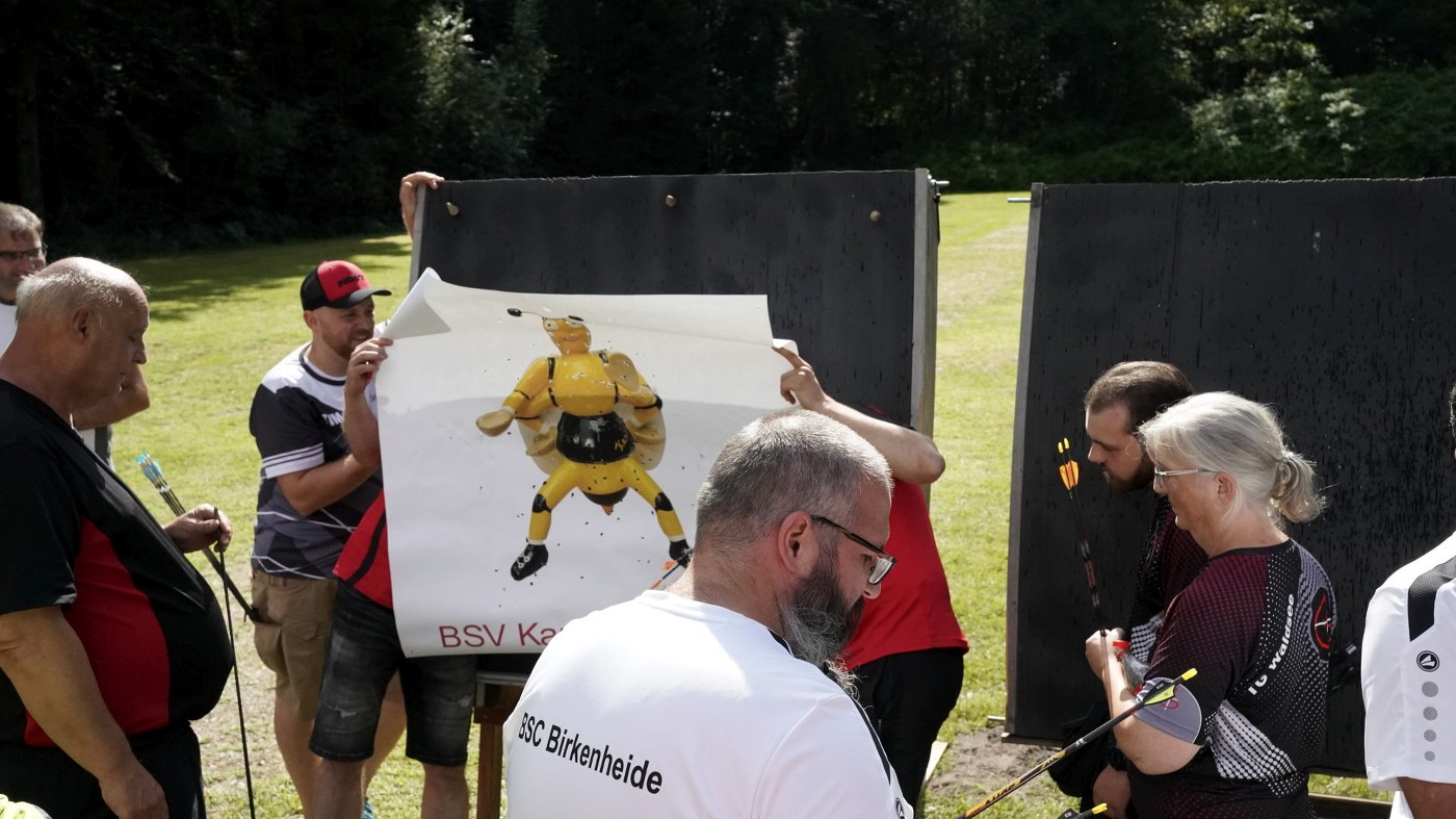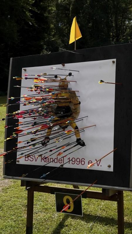 Besonders großer Beliebtheit erfreut sich unser Glücksschuss, der immer nach dem Wettkampf durchgeführt wird. Die Schützinnen und Schützen schießen hierzu Pfeile auf unsere Bienwald-Biene. Wer dabei am nächsten an eine geheim markierte Stelle trifft, gewinnt einen riesigen Präsentkorb. Die Spannung, wer am Ende das meiste Glück hat, war vorprogrammiert.