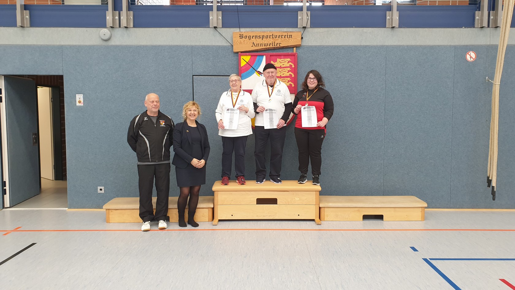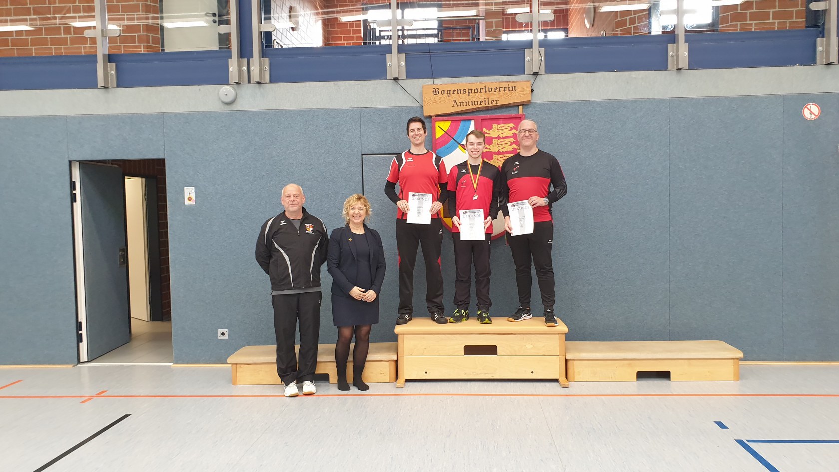 Außerdem holten auch unsere Compound Mannschaft (Christopher, Dirk, Manuela) und unsere Recurve Mannschaft (Perrin, Alexander, Thorsten) den TItel.