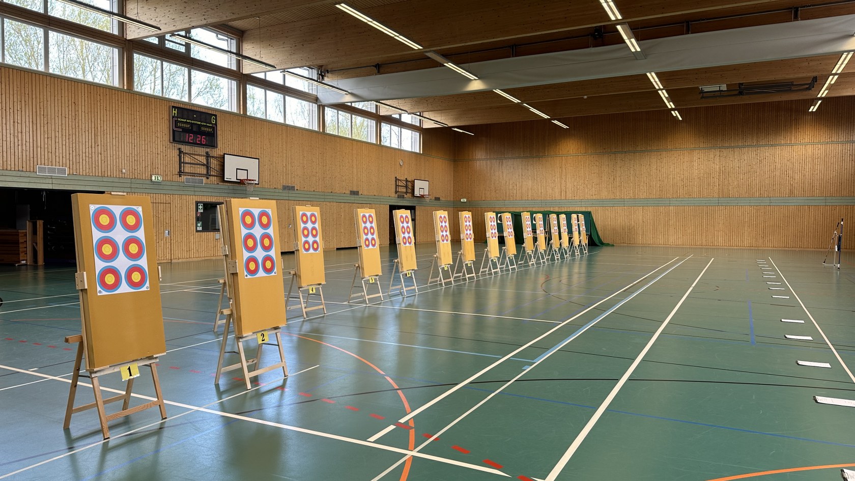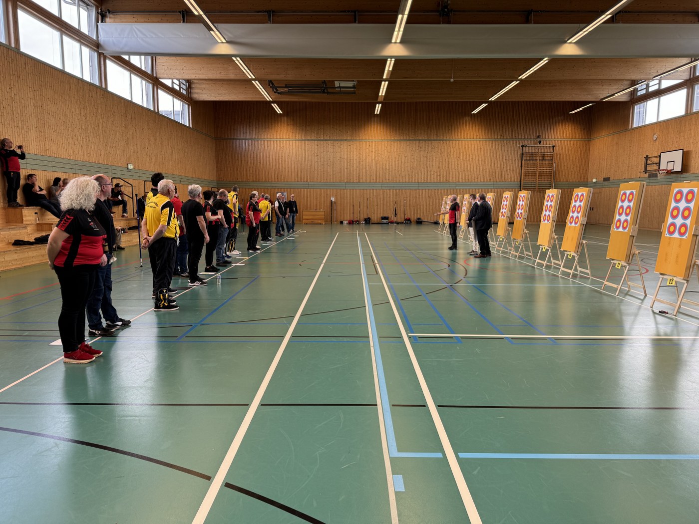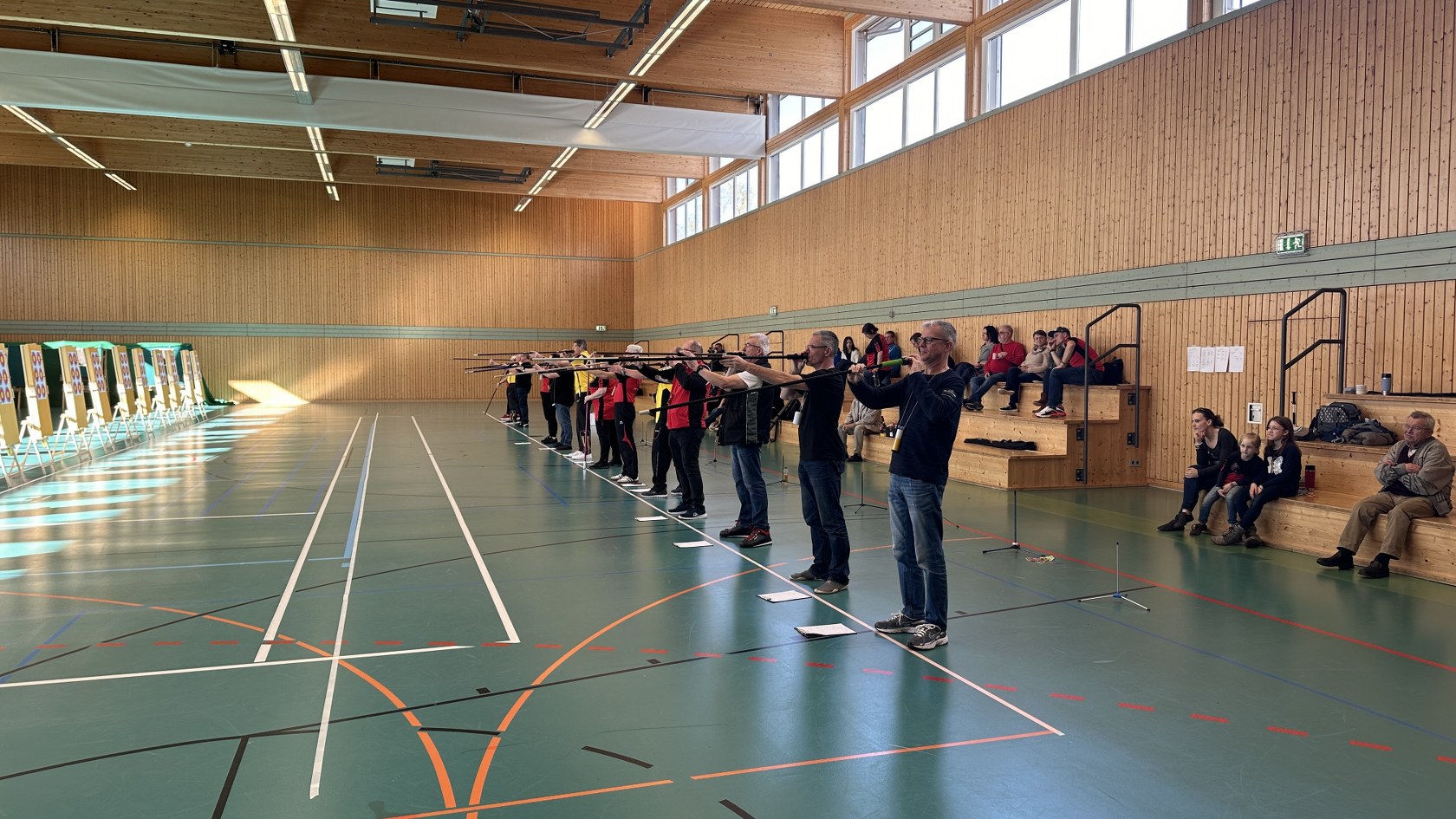 geschossen werden hier 15 Pfeile auf 25 Meter.