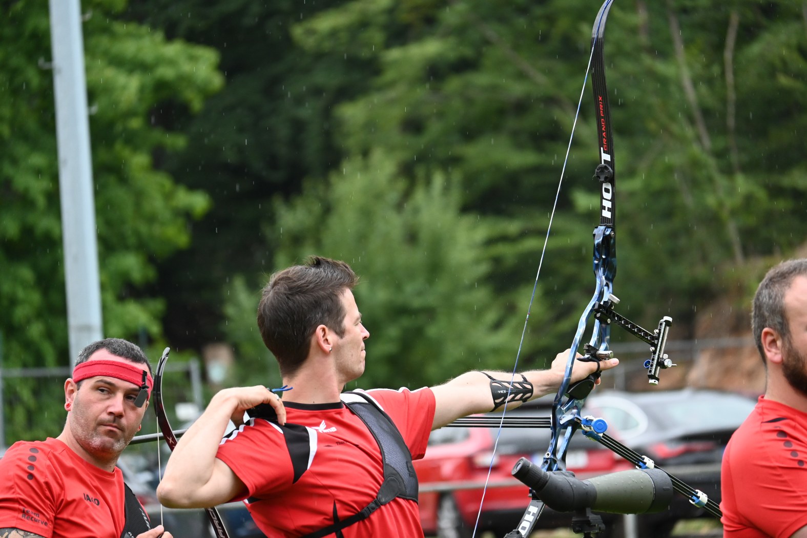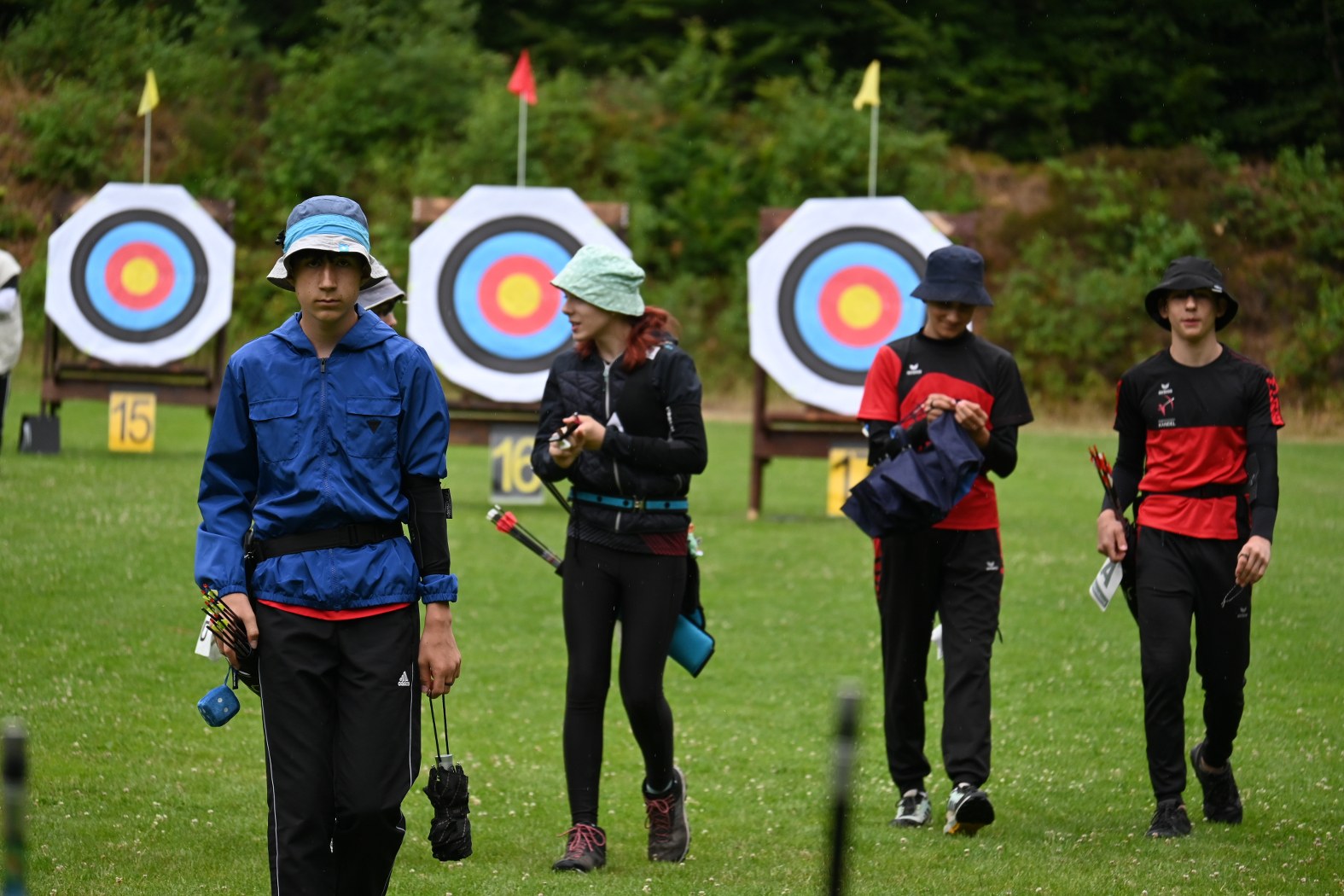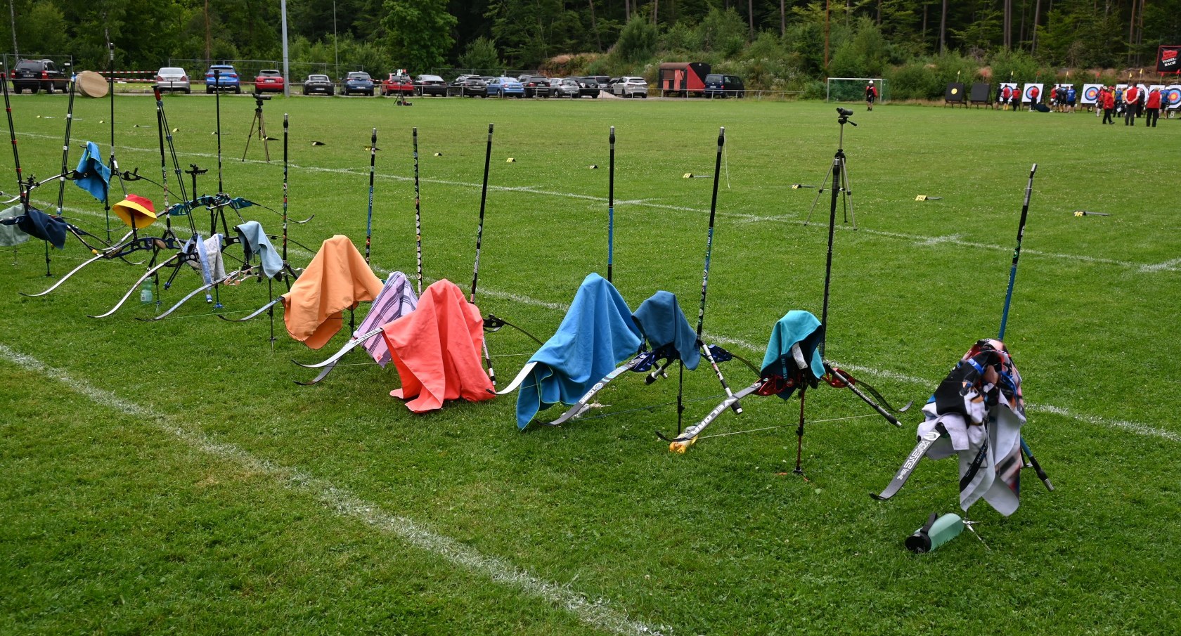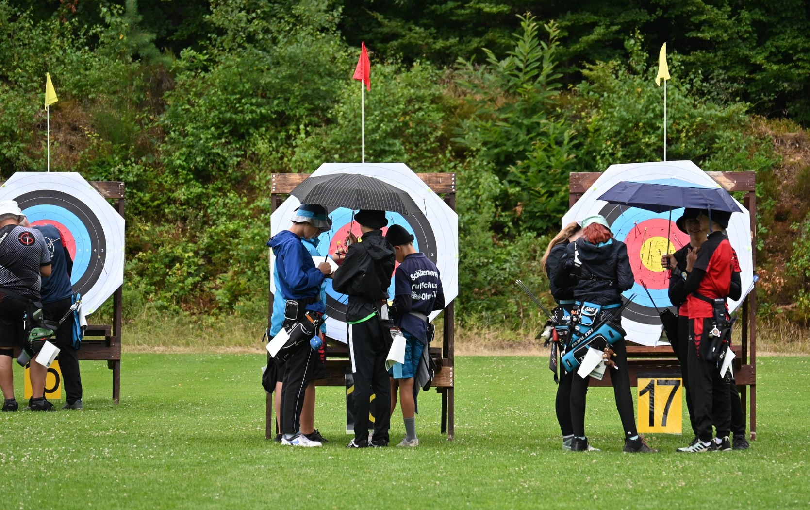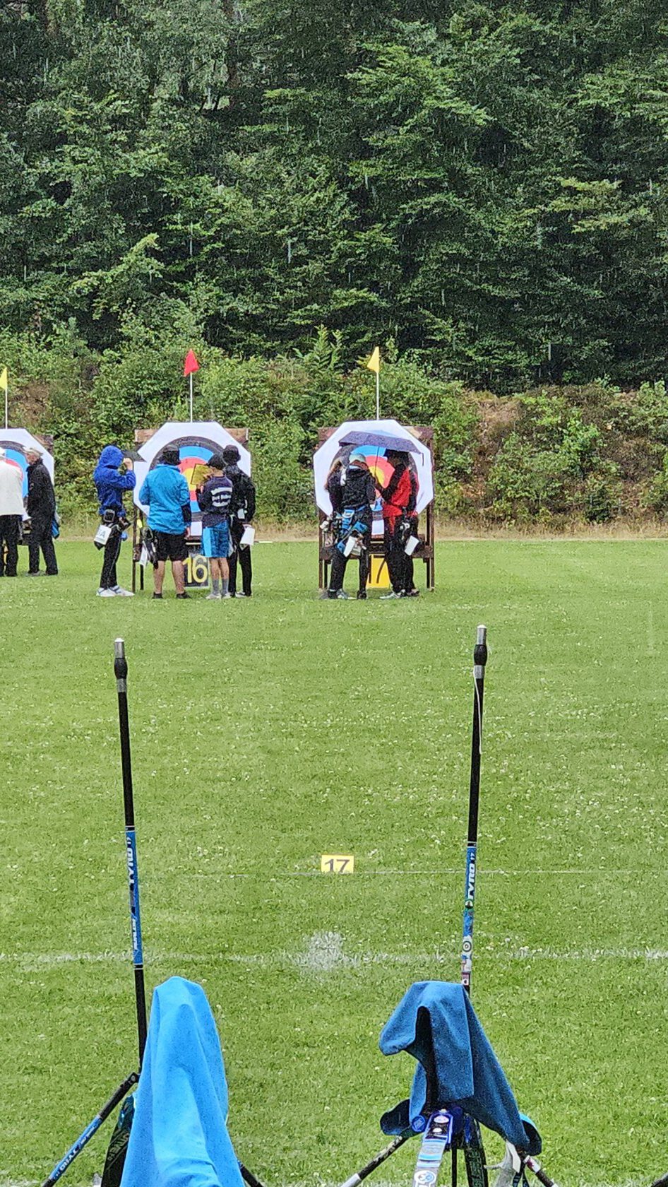 Sonntags waren dann die Recurveschützen an der Reihe. Statt des sonnigen Wetters des Vortags war heute Regen und Wind angesagt. Keine einfachen Bedingungen für die Teilnehmer.