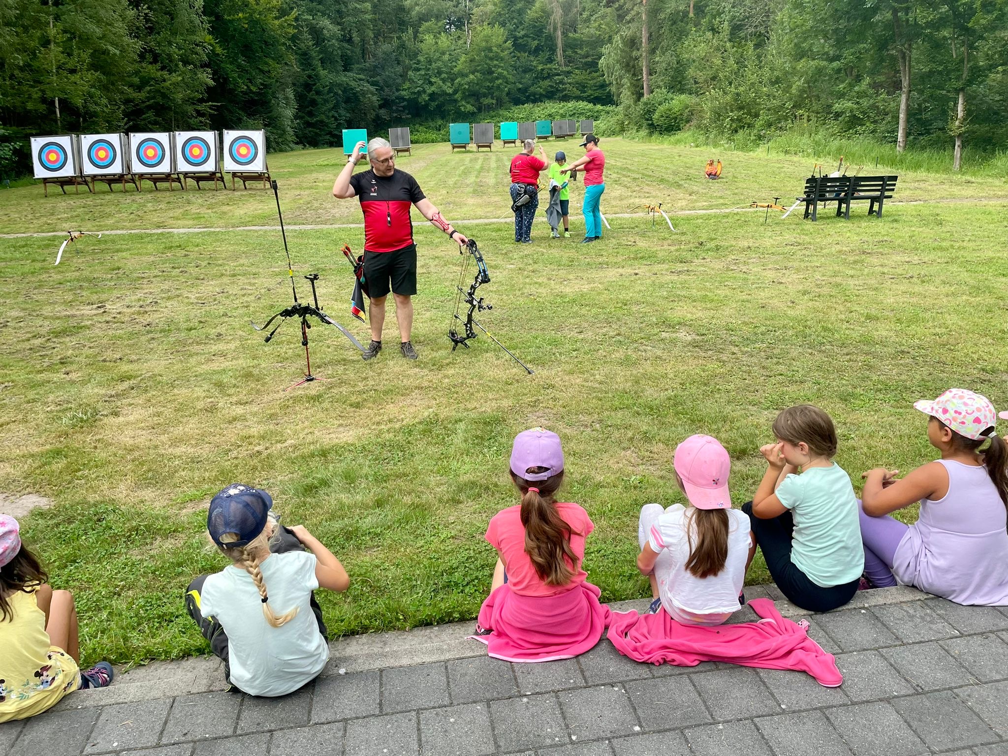 Im Rahmen der Jugend-Ferienwoche der Stadt Kandel hatten am 1.8.2024 von 9-16 Uhr 30 Kinder die Gelegenheit sich auf der Schießanlage des BSV Kandel in die Grundlagen von Bogen- und Blasrohrschießen einweisen zu lassen. Die TeilnehmerInnen im Alter von ca. 6-10 Jahren wurden in 3 Gruppen eingeteilt, die jeweils 1,5 Stunden trainieren konnten. Bei schwül-warmen Wetter wurde jede Gruppe zur Hälfte in Blasrohr- und Bogenschützen aufgeteilt.