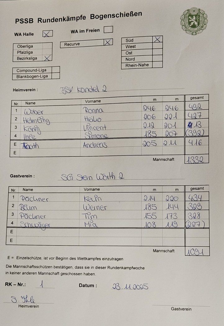 Motiviert und voller Vorfreude startete unsere 2. Recurve-Mannschaft heute in den ersten Rundenkampf der Bezirksliga. Für einige Schützinnen und Schützen war es der erste Wettkampf dieser Art – doch von Nervosität war auf der Schießlinie nichts zu spüren. Nach einem kurzen gemeinsamen Aufwärmen und konzentrierten Einschießen ging es in die erste Begegnung gegen die SG Stern Wörth 2.