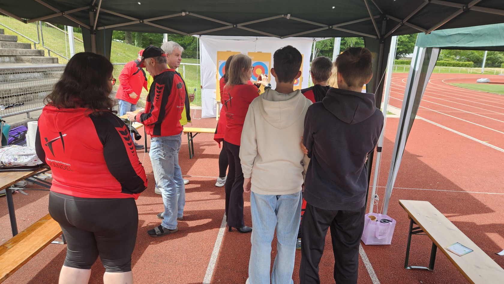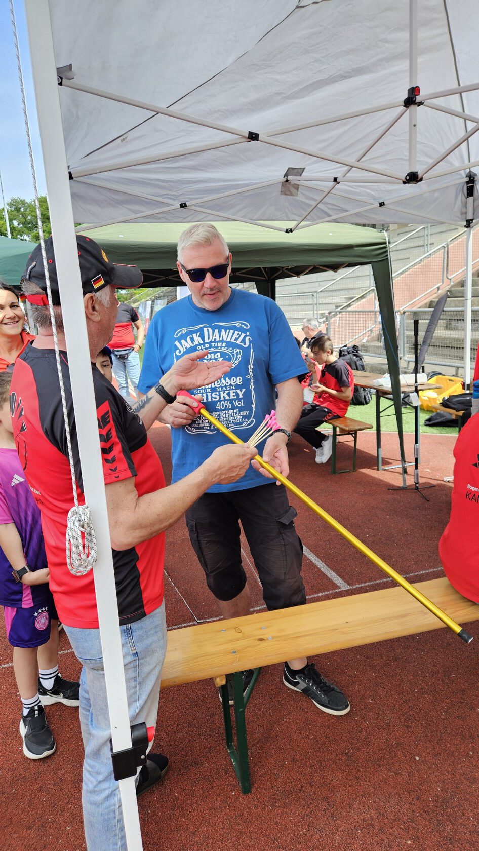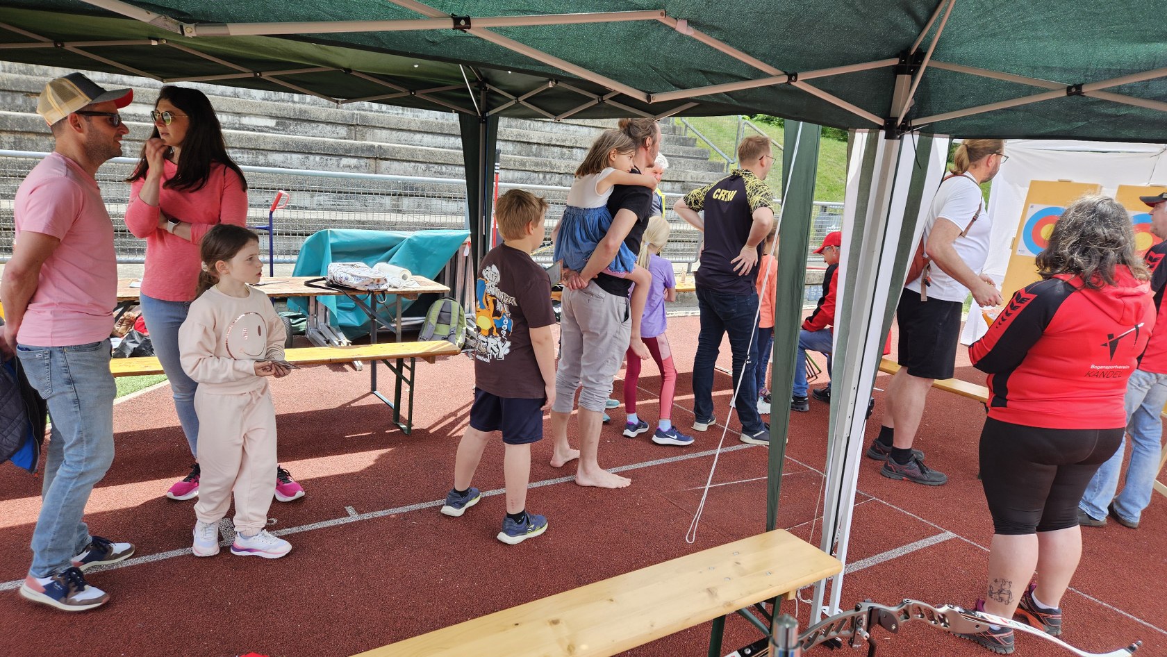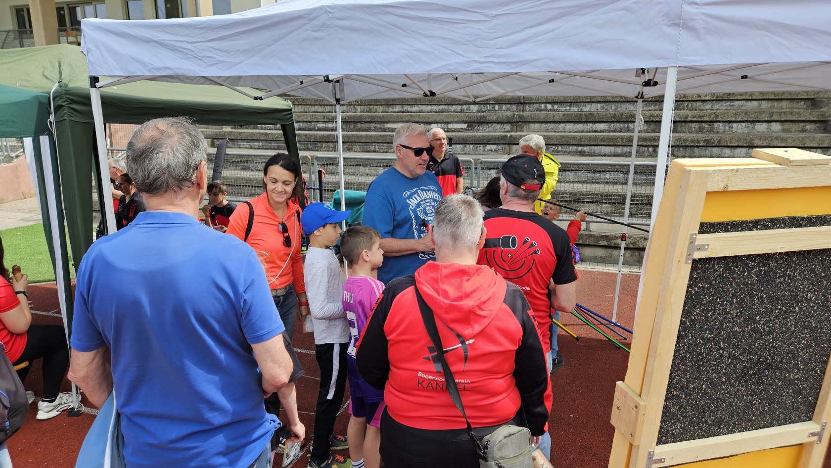 Dank guter Vorbereitung waren die zwei Pavillons, die vor dem angekündigten Regen schützen sollten, schnell aufgebaut. Die Vereinsfahnen und die große Zielscheibe zogen schon von Weitem die Aufmerksamkeit auf sich.