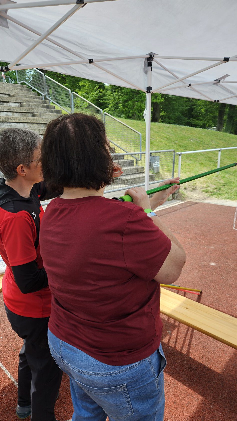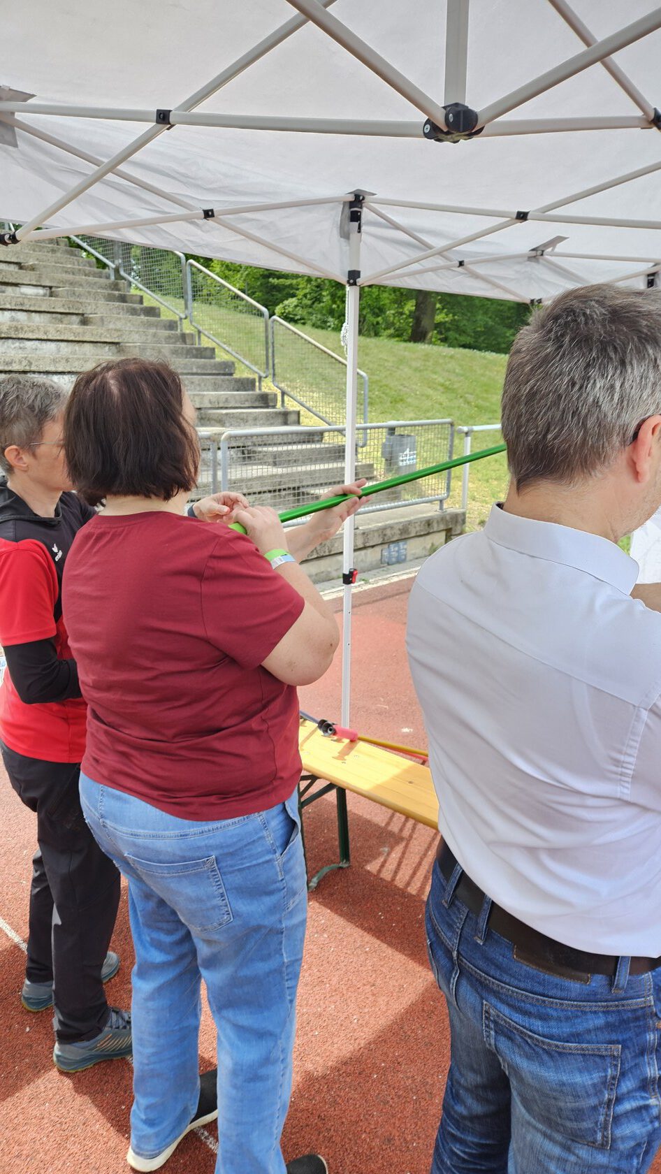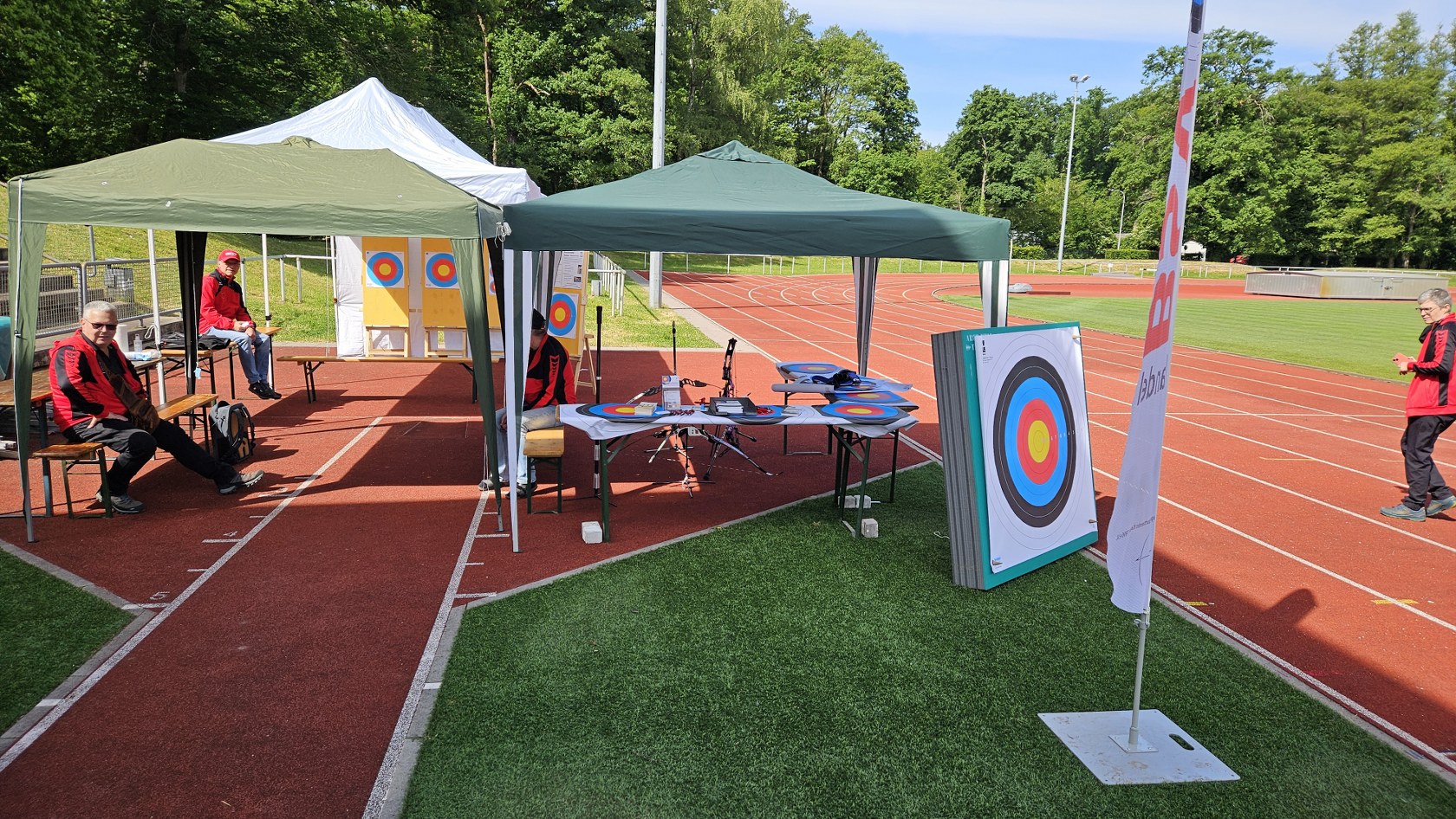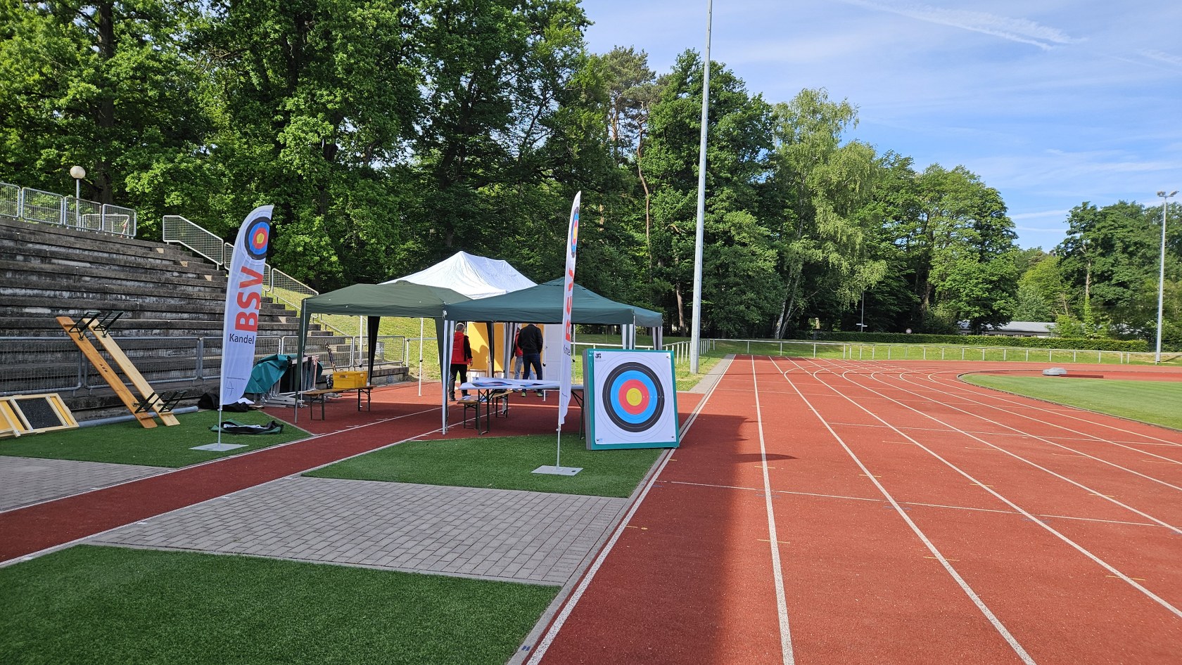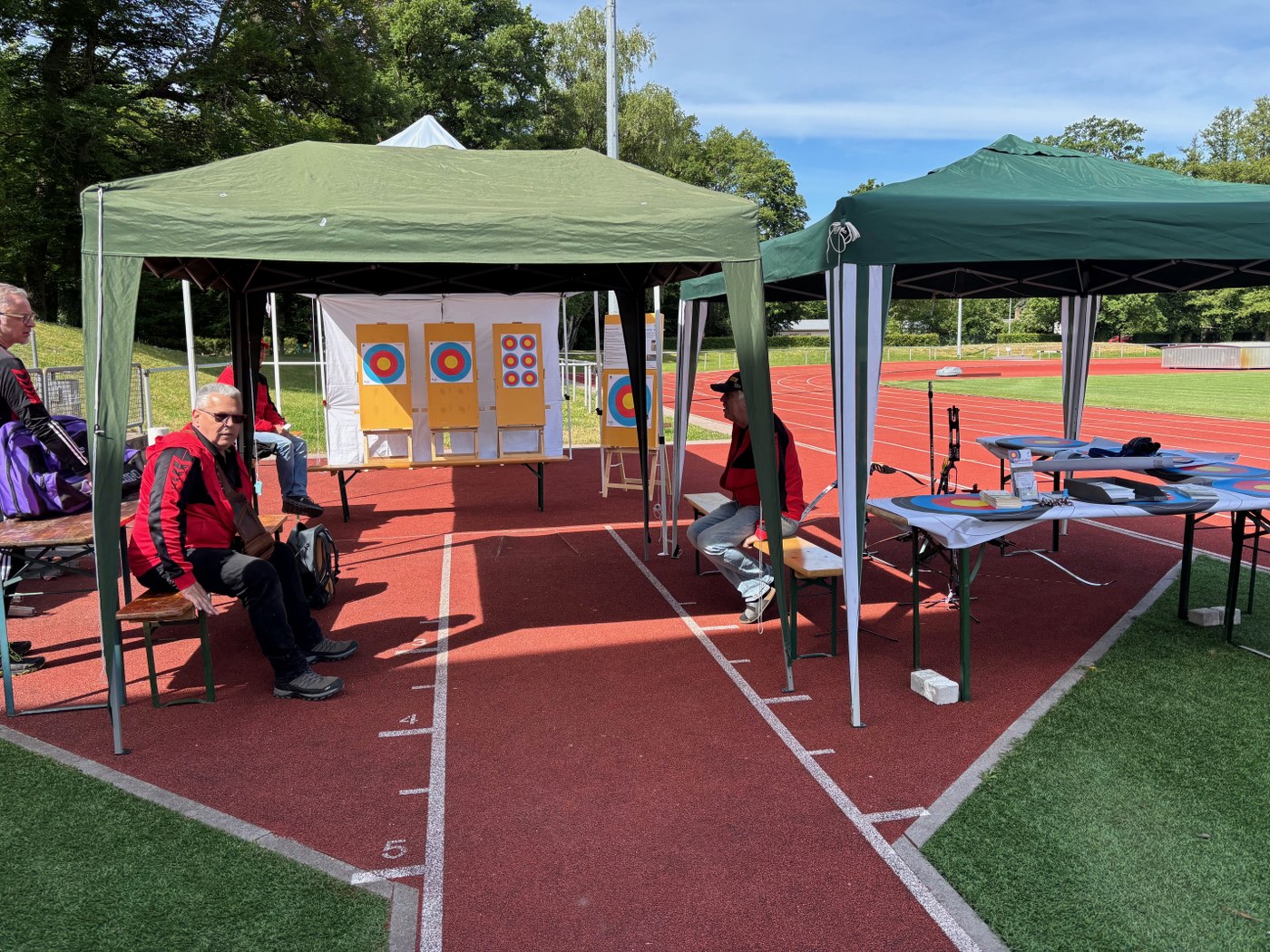 Dank guter Vorbereitung waren die zwei Pavillons, die vor dem angekündigten Regen schützen sollten, schnell aufgebaut. Die Vereinsfahnen und die große Zielscheibe zogen schon von Weitem die Aufmerksamkeit auf sich.