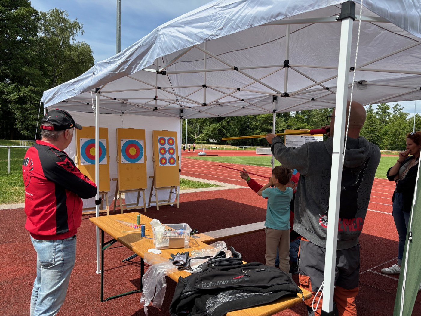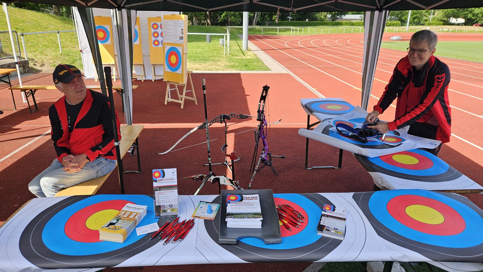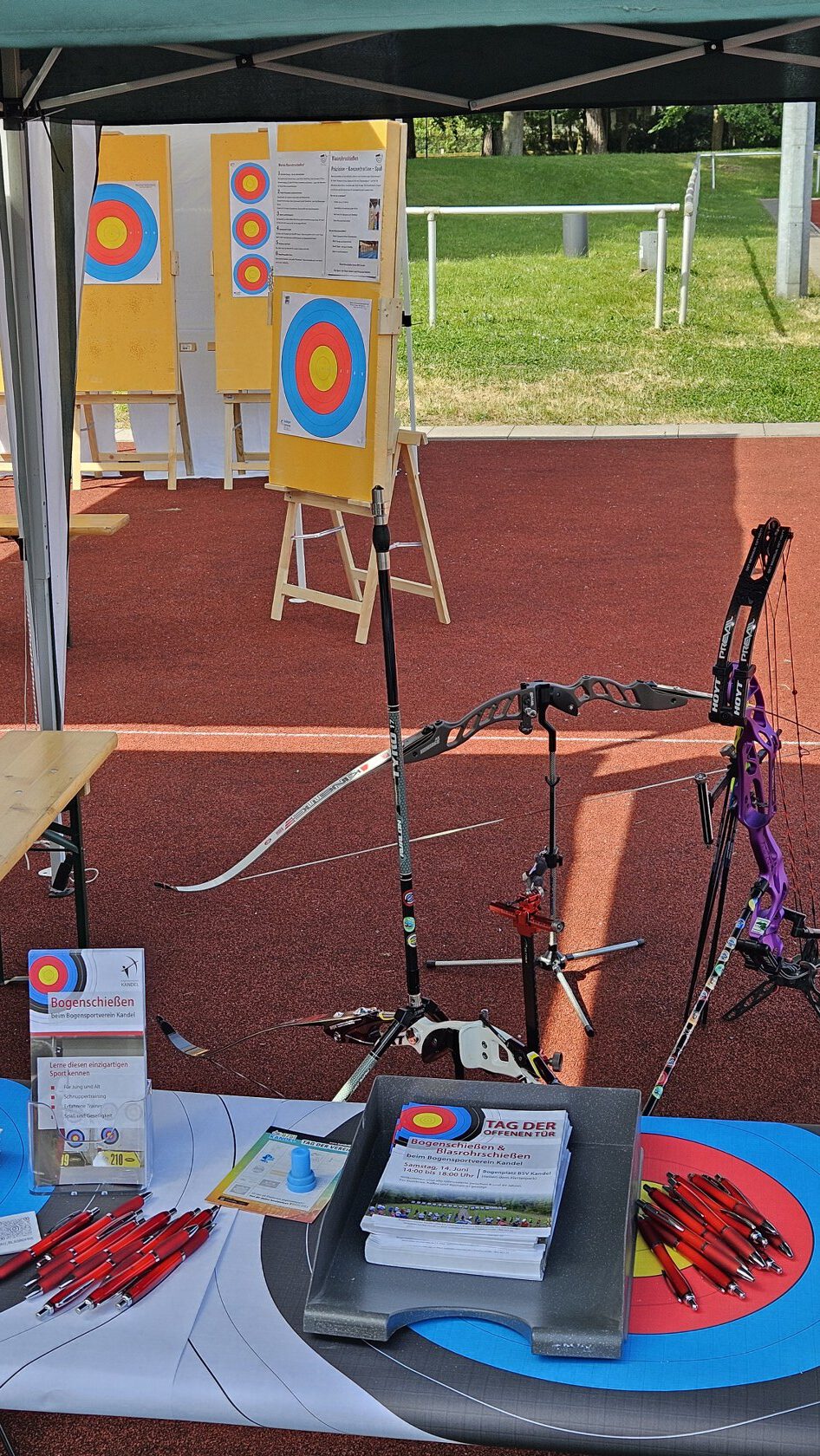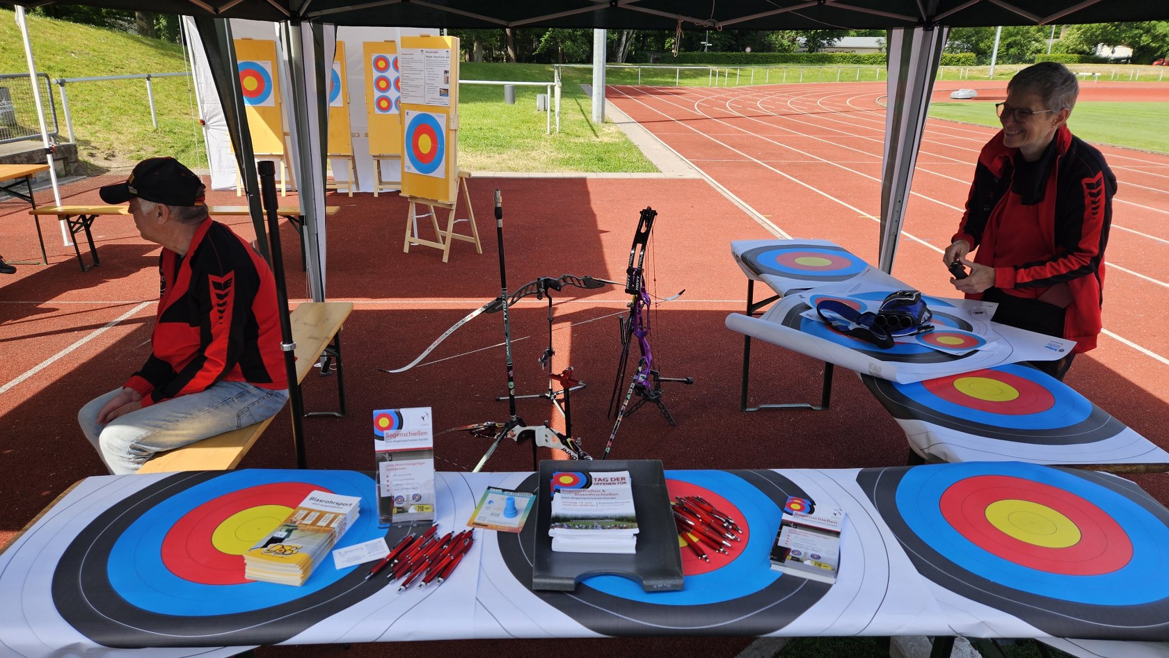 Leider war aus Sicherheitsgründen die Bogensparte nur in der Theorie präsentiert worden: Interessierte konnten sich die Bogenklassen Blankbogen, Recurvebogen mit Visier und Compound vor Ort genauer anschauen und die Unterschiede erklären lassen.