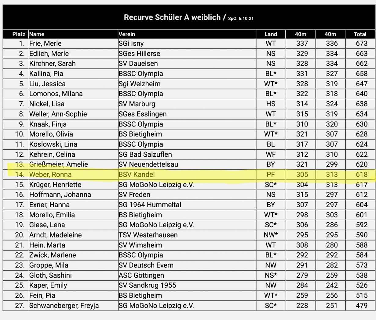 Bei Temperaturen um die 30 Grad schoss Ronna im 1. Durchgang 305 und im 2. Durchgang 313 Ringe. Insgesamt also 618 Ringe und damit auch Saisonbestleistung für sie. Ronna erreichte damit Platz 14 der 28 Teilnehmerinnen der Klasse Schüler A weiblich. Eine hervorragende Platzierung für die Landeskaderschützin aus Rheinland-Pfalz, auf die sie zurecht stolz sein kann.